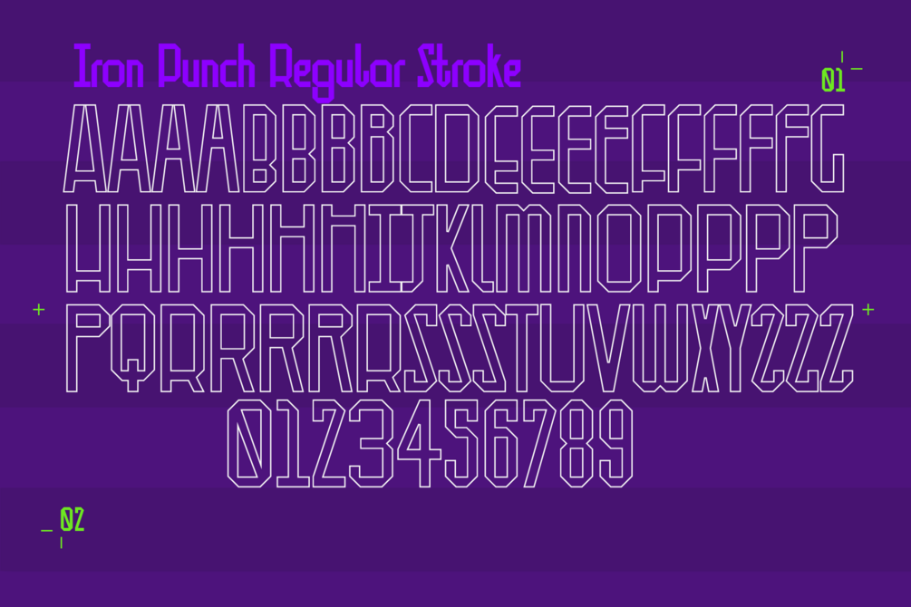 Iron Punch is a simple and modern display font that offers a clean new look for your designs. Letters "A,B,E,F,H,P,R" have different heights that can be changed as glyphs.