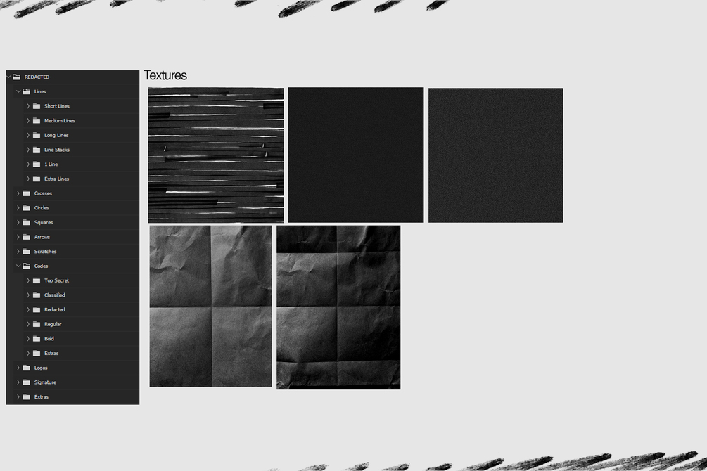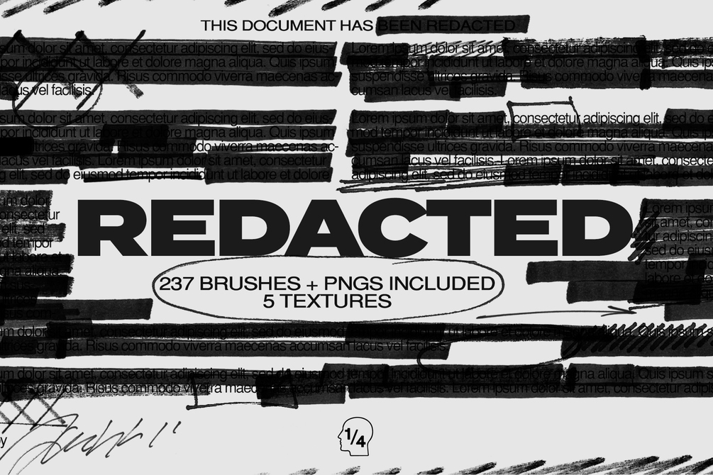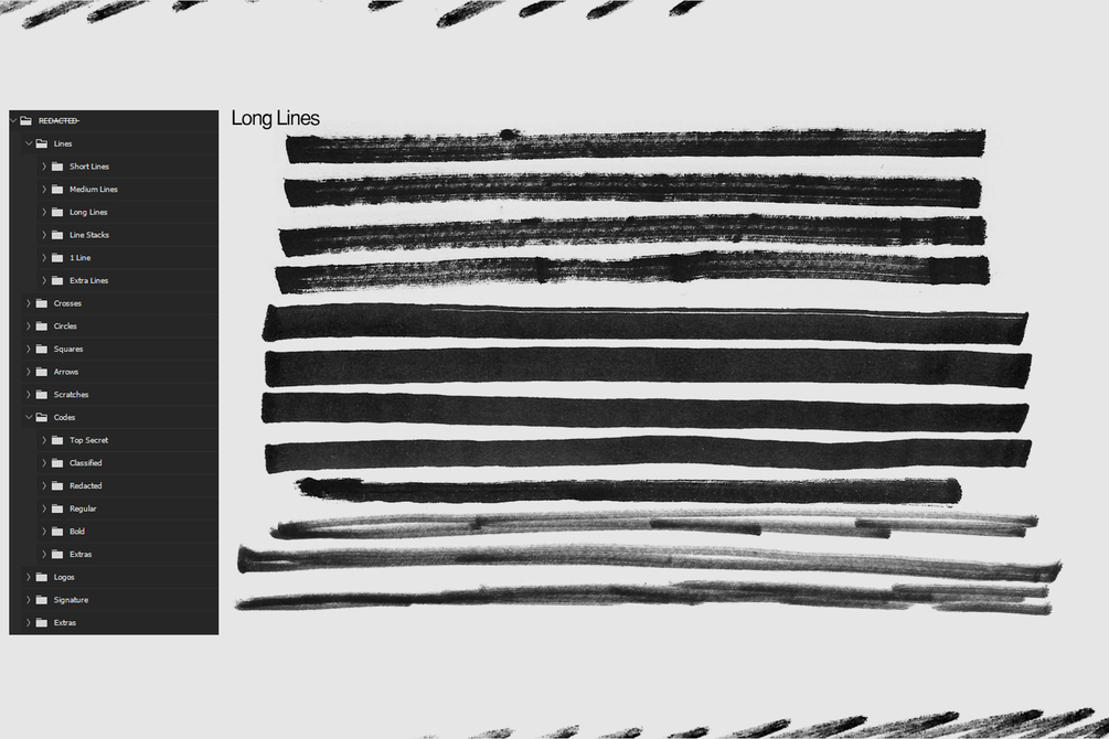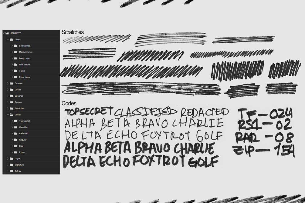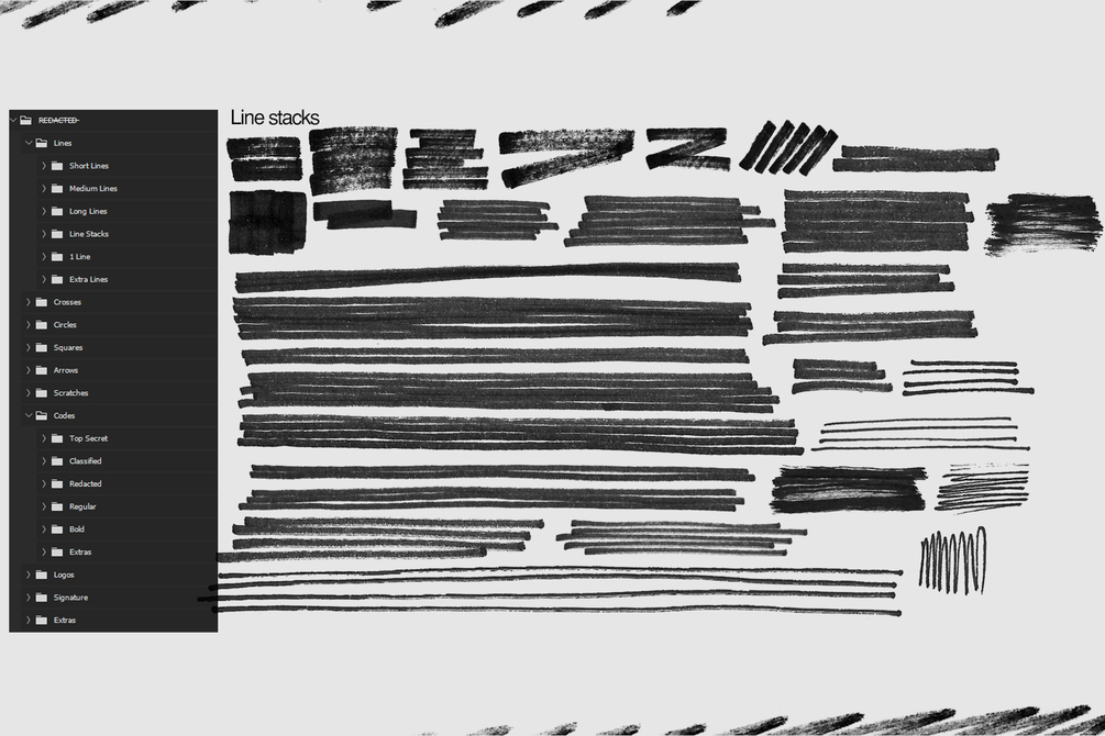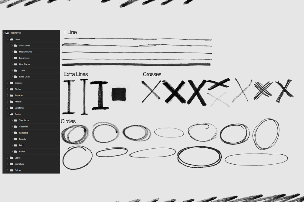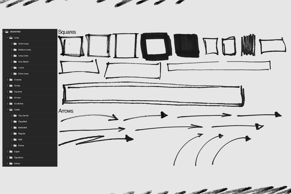 237 Photoshop Brush Stamps + pngs of each brush included + 5 textures to create redacted/classified documents